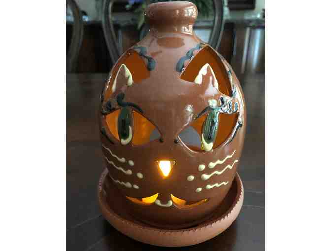 Cat-O-Lantern is 6.5” high, 4.5”wide and 5.5” deep: a jug style red ware with openings to illuminate a table by votive candle. Dot Dish is 5.25” in diameter and is the perfect size to use as a coaster for the Cat-O-Lantern when burning a votive candle to protect modern day surfaces.