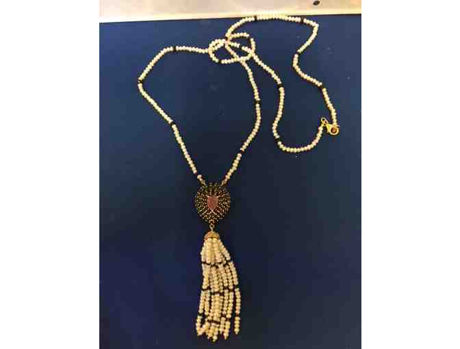 Pearl Tassel necklace with Ruby and Sapphires set in silver gilt