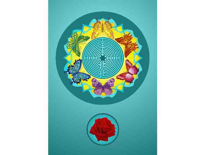 “Aqua Rose Labyrinth” is an image created from an original oil painting and digitally created elements by Jacquelyn Paull. The butterfly color wheel depicts the circle of rebirth in the spring with the Labyrinth at the center. Anchoring this is the Red Rose. The size of the image is 4 5/8" x 6 5/8" printed on 6 ½ x 9 ½ paper using Epson UltraChrome archival inks. It is printed on Epson Presentation paper and mounted in a mat. The whole piece is 8" x 10" and ready to put into a frame. This image is a signed limited edition of 25 with 2 Artist Proofs. All are signed and numbered by the artist. Your print is signed under the mat for a clean look. It comes with a certificate of authenticity. Jacquelyn Paull has been creating labyrinth paintings and digital art for many years. She has a BA in art from San Francisco State University and has exhibited extensively in the Bay Area and in Hawaii.