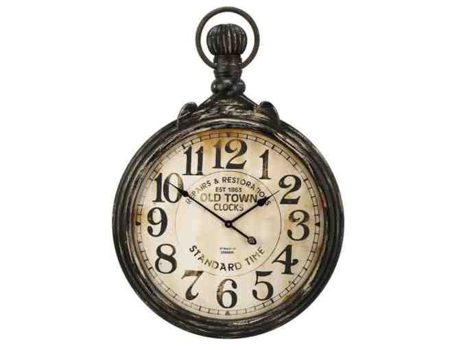 The Churchill Pocket Wall Clock from IMAX Corporation is an oversized wall clock inspired by the styling of an antique men's pocket watch. It features a clock face with an antique finish and an aged patina metal frame.
