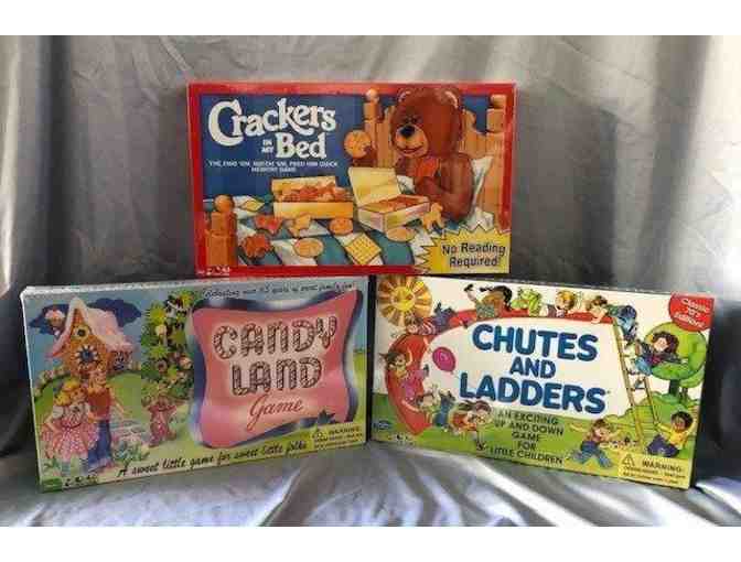 Have a fun filled family game night with these classic games: Candyland, Chutes and Ladders, and Crackers In Bed.