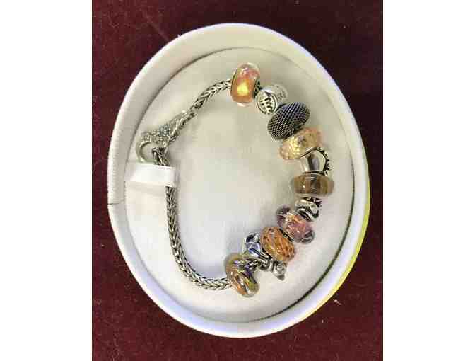 This gorgeous Pandora style bracelet is adorned with genuine vintage silver beads (a mix of Chamilia, Troll and Pandora) along with 6 Murano Glass Beads. The five silver beads include a kitty food dish, paw print, tiny kitten, a cat, and copper colored mesh.