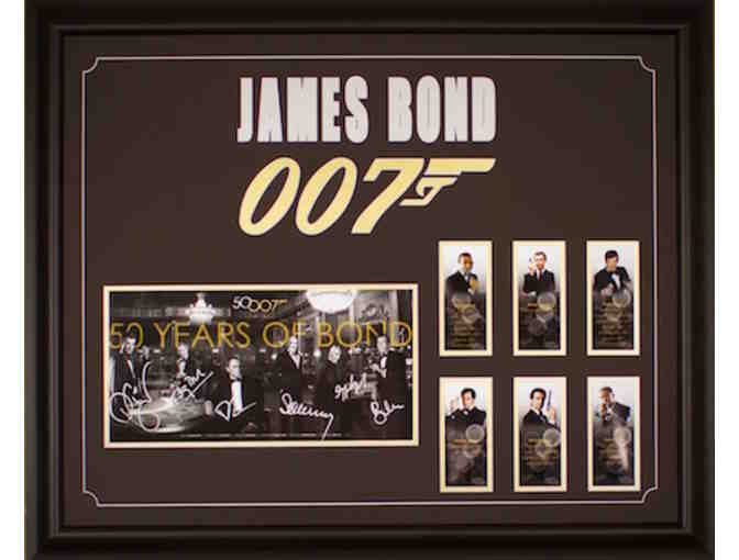 Do you know a die hard 007 fan? This Limited Edition, custom framed piece celebrates 50 years of Jame Bond, with exclusive, black and white photographs and signatures from six (6) actors, who all portrayed the famous MI6 special agent, including: Sean Connery, George Lazenby, Roger Moore (d. 5/23/2017), Timothy Dalton, Pierce Brosnan and Daniel Craig. Museum quality with amazing detail, such as gun logo triple laser-cut in the matting of the frame.