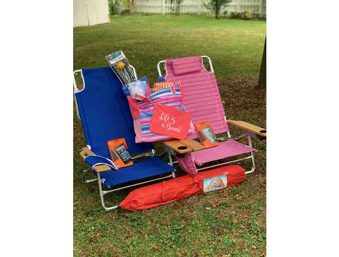 Includes: 2 beach chairs, towels, beach bag, sunscreen, magazines, and TWO Amazon Fire 7 Tablets.