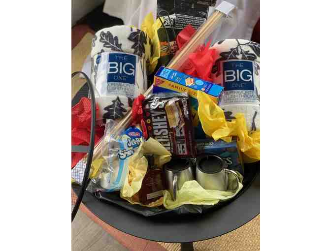 Includes: Fire pit, bag of charcoal, lighters, chocolate, graham crackers, marshmellows, hot chocolate, skewers, 2 throw blankets and stainless steel mugs.