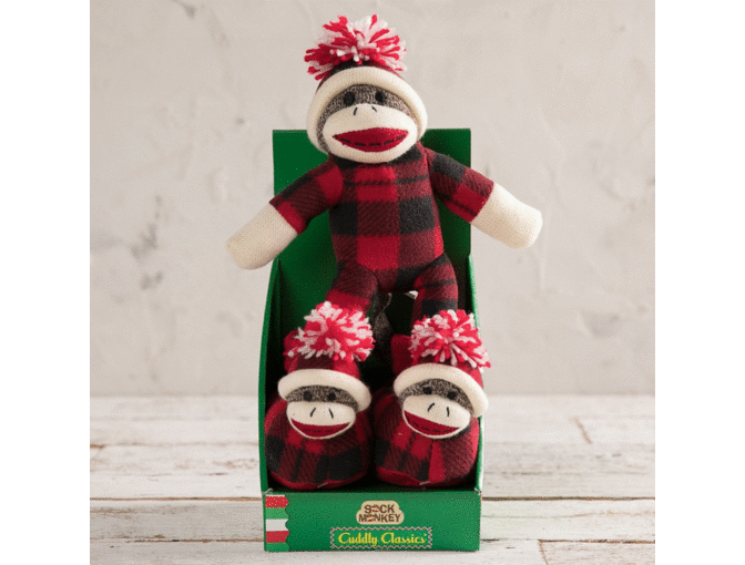 This cute and cuddly sock monkey comes with slippers for the lucky little one.