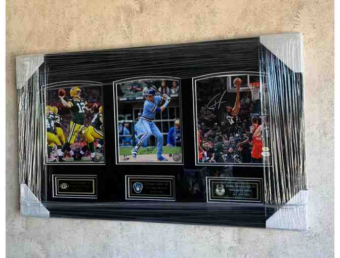 Don't miss your chance to win this item for Wisconsin sports fan 18"x33" Framed print which includes signed photos of Aaron Rodgers, Chritian Yelich and the Greek Freek.