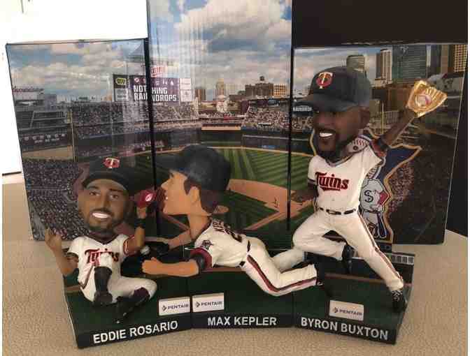 Nothing Falls but Raindrops Bobbleheads - Kepler, Buxton and Rosario with panorama backdrop.