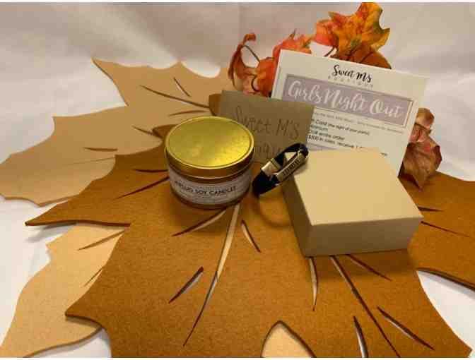 This Sweet M's Basket contains a woman's bracelet, soy candle, and $25 gift card.