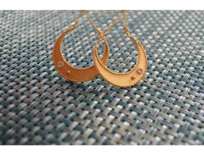 These beautifully artistic drop earrings are something special. Suspended on their chains, the crescent moons refer to the moon's rich symbolism of protection, nourishment and goddess. As an accent, white topaz, a stone of awareness, creativity and individuality, adds shine as it catches and reflects light. Prepare to be enchanted!