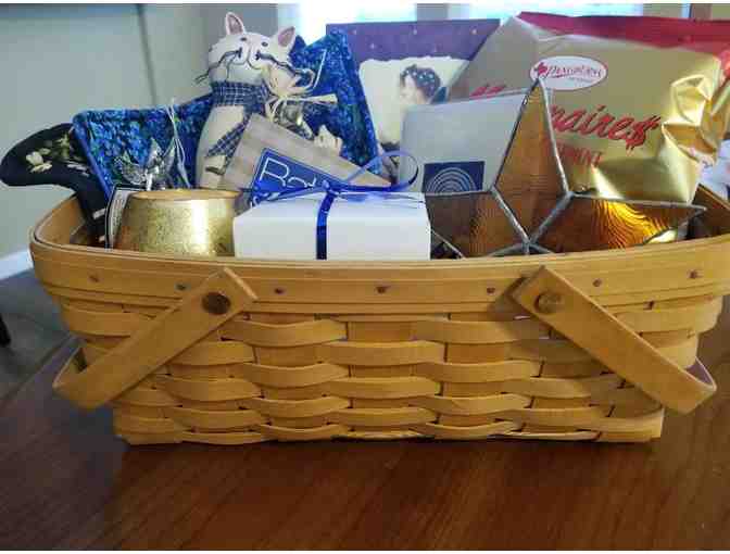 This lovely basket bundle comes to you from Texas. Inside the Longaberger basket are a bag of Millionaire chocolate candies made in Texas. There are also 2 handmade (not by me) microwave potholders. I love these and use mine everyday. There is also an angel to watch over you and a journal for your thoughts. I included a stained glass star which I made. There is a Labyrinth card and a cat from my collection. I have included a $25 gift card from Bath and body works and oh yeah a mystery gift.