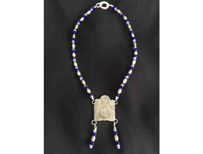 Replica of a Chartres Pilgrim Badge attached to a 20" necklace of blue iolite crystal and glass beads with silver oval spiral spacers and silver clasp.