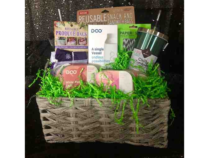 Interested in adopting a more plastic-free routine? This eco-friendly gift basket contains a few items to help you get started like Drinkinity bottle and pods, reusable beverage cups with straws, resuable produce shopping bags, resuable snack bags, and set of paper straws.