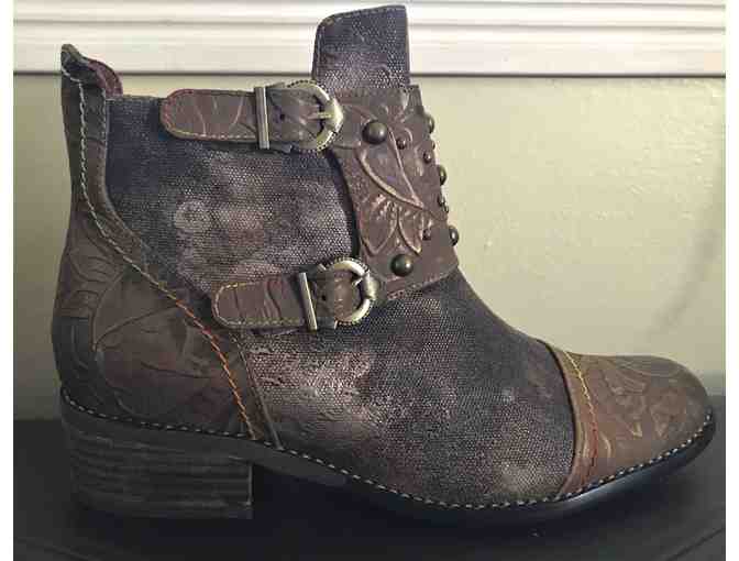 A pair of Spring Step L'Artiste Booties in size 8.5. A pair of Socksmith Wine Lovers socks are included. If they don't fit, bring them in to Stan's & they will exchange them for a different size or style up to their value!