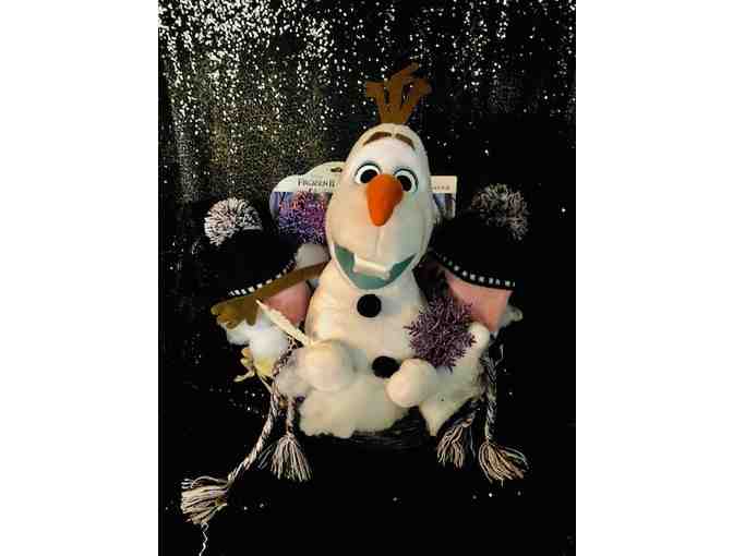 Do you want to build a snowman? Kick-off the winter season with this Frozen themed basket that contains an array of toys such as a Frozen children's book, lip glosses, sticker/nail set, stuffed Olaf plush toy, two pink/navy winter pom pom hats, and passes for two to enjoy ice skating at the Ice House in Hackensack, NJ.