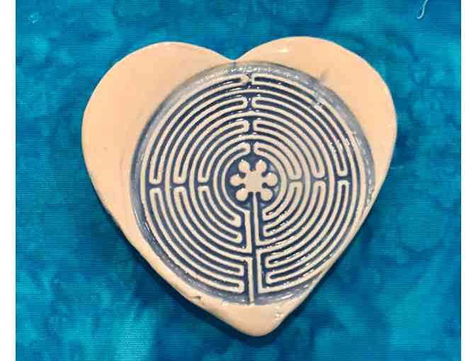 Heart shaped one of a kind double sided handmade pocket clay labyrinth! One side has a blue Labyrinth and the other side has a green Celtic tree of life. It comes with a small black velvet pouch. 2 inches by 2 inches