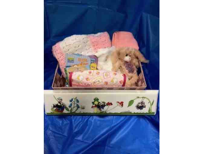 Basket includes receiving blankets, bib, decorative door hook, and a beautifully crocheted blanket perfect for a new baby girl.