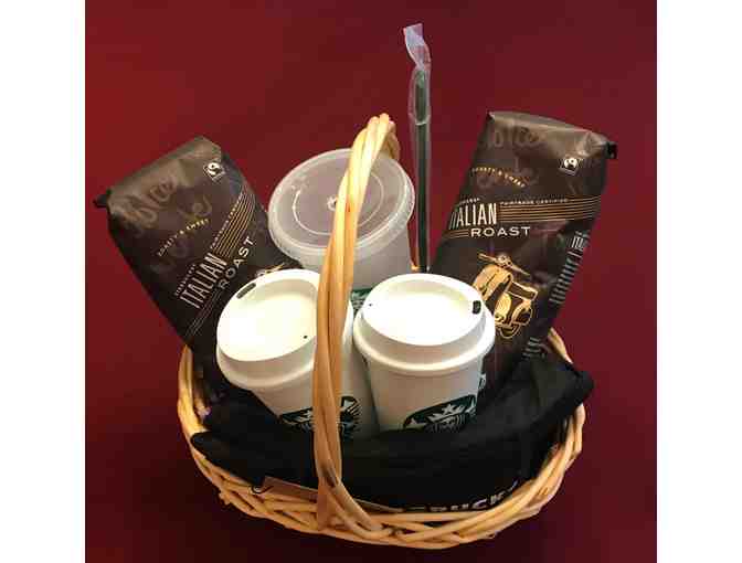 Starbucks is offering two bags of Italian Dark Roast Starbucks beans; reusable branded tote bag; and hot and cold beverage holders.