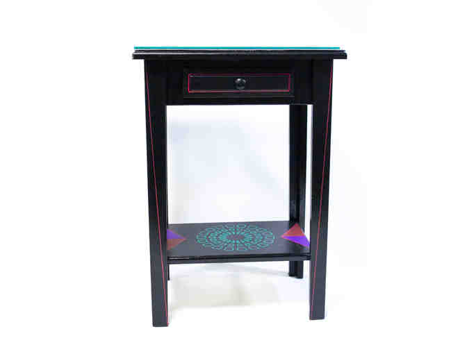Painted side or display table that stands 26"H with the top that measures 14" X 18" holding a 10" X 18" glass insert, and a lower shelf that measures 11" X 16". A combination of colorful lines and shapes on a mostly black background, this table is decorative enough on its own or can hold plants, books, or knick-knacks. Hand-painted by Joel Cohen, the "artist-in-residence" at The Food Market in Hampden, La Food Marketa in The Quarry, Piedras Calientes in Reisterstown, and Joel Cohen Paintings.