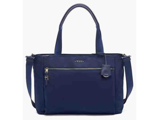This is the tote you can take anywhere—and everywhere. Color is Midnight Blue. Featuring a padded laptop pocket, a water-resistant water bottle pocket, and a host of organizational pockets, it keeps you both organized and chic. Padded laptop compartment with leather snap tab closure (13")Tablet pocketZip pocket with TUMI Tracer®Collapsible water-resistant water bottle pocket EXTERIOR FEATURES