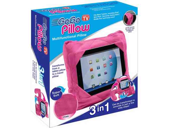 Make travelling a little comfier with this 3-in-1 functional pillow! Gogo pillow converts from a cushioned tablet holder to a lap pillow to a neck pillow. Attached straps allow it to be mounted on a headrest for tablet viewing in cars, planes, etc. Super soft and fits most tablets. Appropriate for all ages.