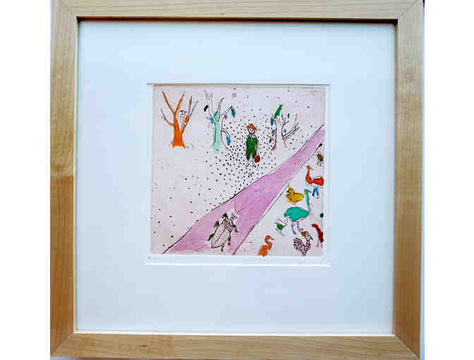 A pair of hand-colored fine art etchings by Harlem-based artist Fumiko Toda. This pair of etchings, titled "Planting: Rosa" and "After Planting" are matted and framed and will come as a pair. Image size: 6 x 6 inches each. Framed dimensions are 11 1/4 x 11 1/4 inches each. Signed and marked "A.P." (artist proof). These artworks are one-of-a-kind original pieces, derived from the artist's own observation, imagination, sketch or photograph and accompanied by a certificate of authenticity.