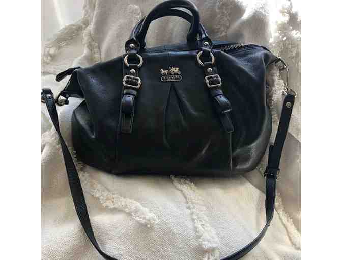 Gently used, Black Coach Purse with Purple Inner Lining - perfect gift for anyone looking for a stylish and realistic purse.