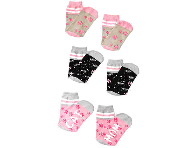 Identify yourself as a cat lover with this 3-Pair Cat Mom Slipper Sock set. All have nonslip grippers on the bottom.