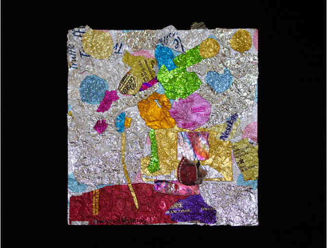 You are bidding on a small, approximately 4-1/4" X 4-1/2", unframed collage that has a silver background with pops of color, created from candy wrappers. Gladys Hack Goldstein (1918-2010) was an abstract painter inspired by nature, who used light, layers, and glorious shapes to convey what was always bursting to be expressed. Mrs. Goldstein studied in Mexico, Santa Fe, and many other places, but she was born, lived most of her life, and produced her largest body of work in Baltimore. She spent her whole life drawing, painting, making paper, creating mixographias and collages, and sculpting because it was her life's calling--it was in her DNA. Her work is in many public and private collections throughout the United States and Europe. The University of Maryland University College exhibition in 2004, "Capturing the Essence: The Art of Gladys Goldstein," celebrated the opening of the Gladys Goldstein Gallery in the UMUC Inn and Conference Center. This gallery is the university's first permanent display of contemporary abstract art.