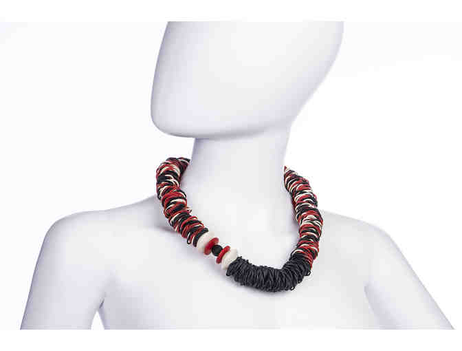 Fun light weight black, red, and white necklace made from rubberbands and beads. Easy to wear many different ways.