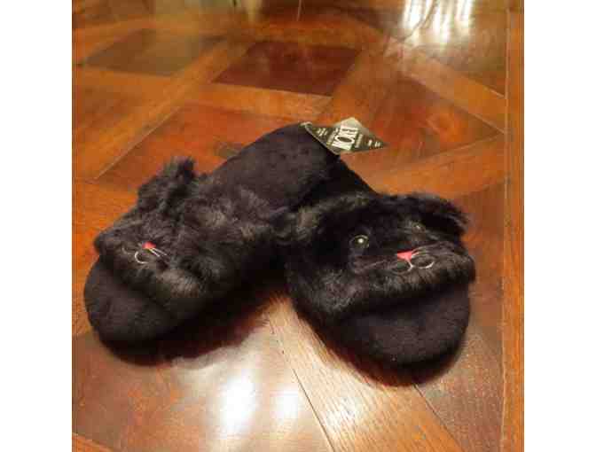 What better way to spend an evening but relaxing with your favorite friend and these awesome black fur (artificial of course) slippers. Slippers feature an adorable little face and cute standing ears and a non skid sole.