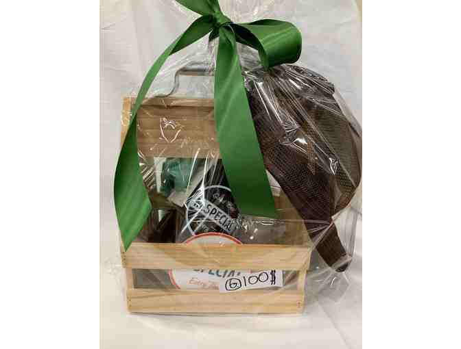 Box full of goodies from our local M Special Brewing Co.! Includes women's XL Tshirt, Growler, Snapback hat and swag in a wooden carrier
