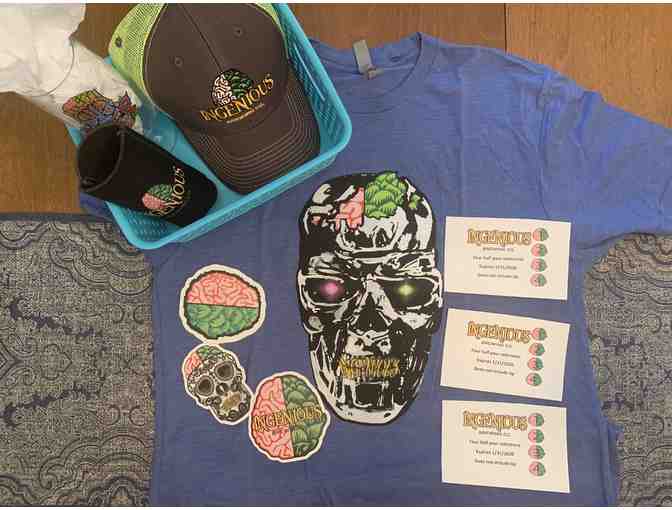 Men's Ingenious Tshirt (L), Trucker Hat, Ingenious Brewing pint glass and koozie, three stickers, 3 Punch cards with 4 punches for 1/2 pour. Winner and two friends will be given a tour of the brewery