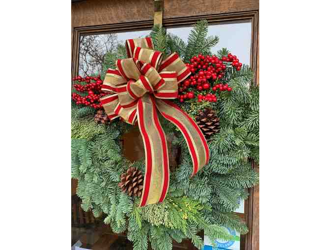 The 2019 wreath is decorated with mixed greens and pinecones. The Lakewood Historical Society’s Women’s Board has been creating holiday wreaths for over 25 years.