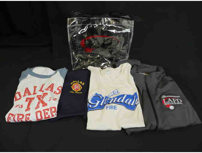 Show off your firefighter pride by showing off exclusive clothes from various fire houses around the USA. Support Widows, Orphans & Disabled Firefighter’s Fund by wearing a one-of-a-kind pullover from one of our most appealing events the LAFD Invitational Golf Tournament. Also included are two shirts from Dallas FD, one from Glendale FD and a clear LAFD Invitational bag.