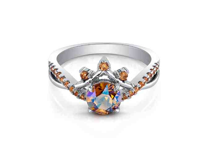 Featuring an iridescent center stone highlighted by tangerine mini stones and a hidden "Wanderlust" inscription.