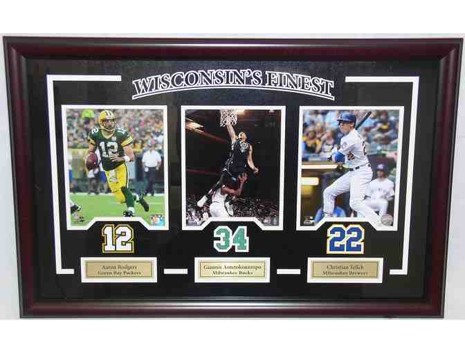 Aaron Rodgers-Giannis Antetogounmpo-Christian Yelich-Three 8x10 photos & engraved plates are framed & matted to an overall size of 23" x 33".