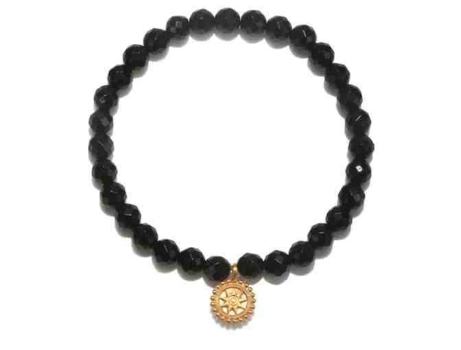 In the enduring cycles of the Universe, we find balance; we discover the light amidst the darkness. A stretch bracelet of black onyx—stone of endurance, perseverance and grounding—is graced with a golden mandala, symbol of the sacred infinite cycle.
