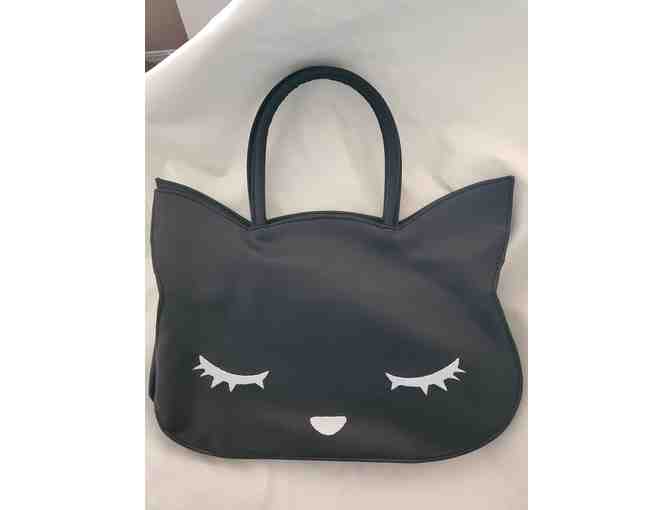 From Cat Lady Box, this large 15" x10" black purse with double hand straps, zippered opening. Zippered area and pockets inside. Closed eyes on bag
