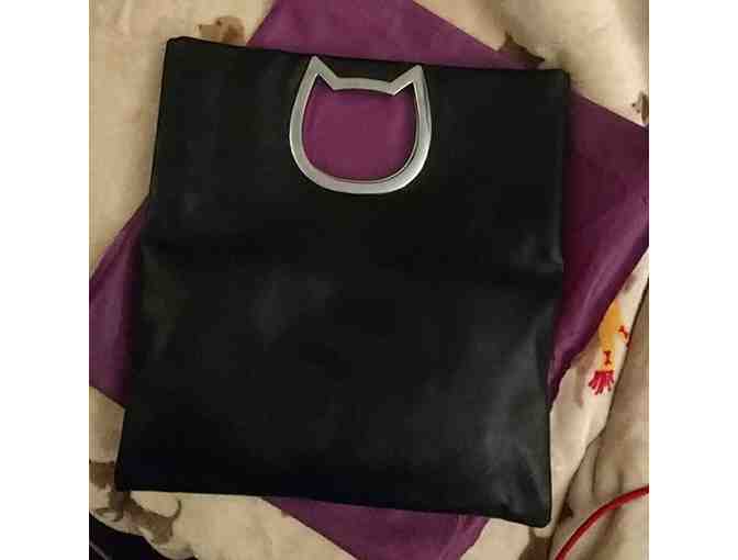 From Cat Lady Box, this very cute and stylish clutch bag measuring 12" x 13". Has silver metal clutch. Zippered area and pockets inside. Has a removable shoulder strap.