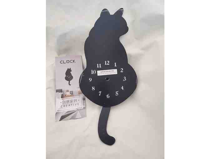 New in box acrylic cat clock. Tail moves. Requires one AA battery not included.