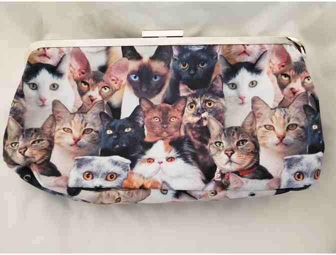 Cat Collage Clutch Purse Measures aprox 11" long x 6" tall. Metal clasp. Black interior with pocket. Silver shoulder chain optional
