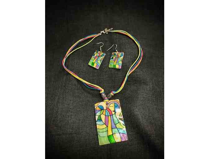 A colorful, modern necklace and earring set made from natural capiz shell. Add a little vibrance and fun to any outfit!