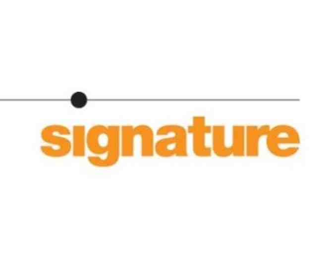 Two tickets to a theater performance at Signature Theatre in Arlington, Virginia. Signature Theatre is a Tony Award®-winning, non-profit professional theater company with a mission to produce contemporary musicals and plays, reinvent classic musicals, develop new work, and reach its community through engaging educational and outreach opportunities. Tickets may not be used on Saturday evening or Pride Night performances.