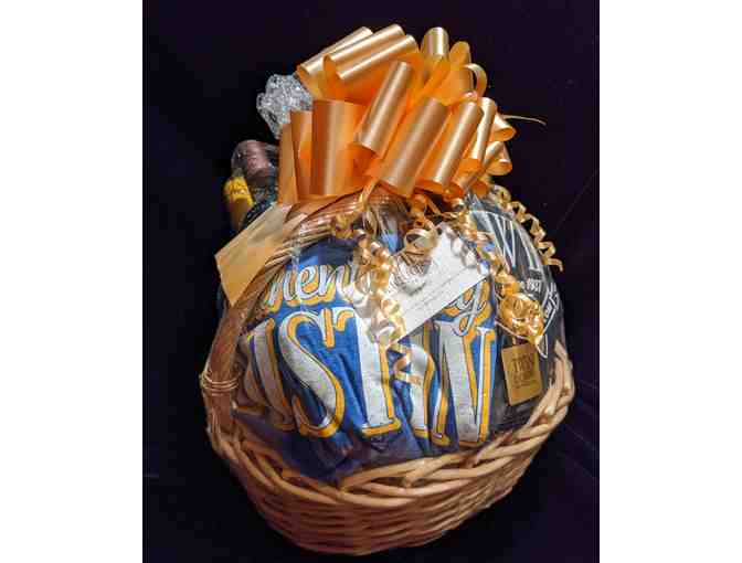 A gift basket valued at $100 including 1 bottle of Natale Verna Sauvignon Blanc, 1 bottle of Cap Royal Bordeaux Blanc, 1 bottle of baus family cabernet sauvignon, 1 Perserverance Zin Lodi, 1 Lagunilla Rioja Cararza, 1 Dom Du Viesl Orne Touraine, Twin Liquors Tote