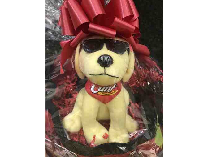 Raising Cane's cooler bag, Be Our Guest Card/Free Kids Combo/Free Lemonade Cards, Hat, Koozies, Two Shirts, and an Adorable Plush Puppy. All valued at $75.