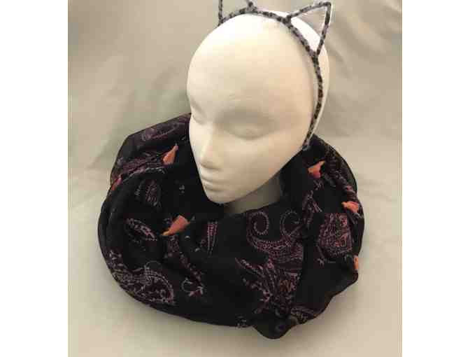 Infinity Scarf, black with pink design and fringe, NWOT,