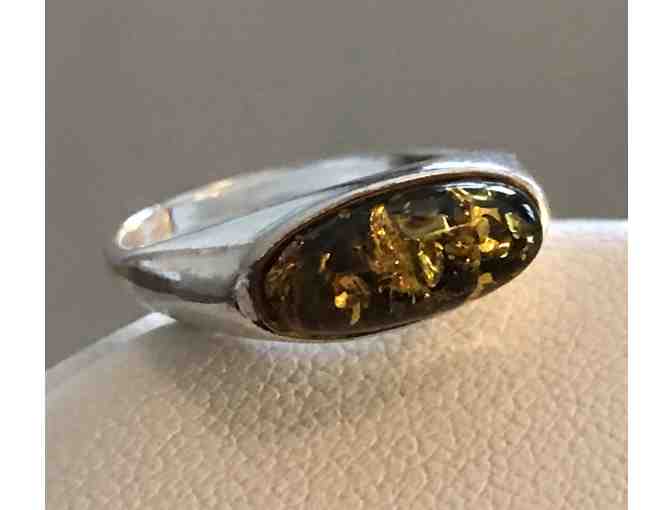Very nice pre owned ring with amber highlights set in a horizontel setting. Very sweet ring in good condition. Aprox size 7-8