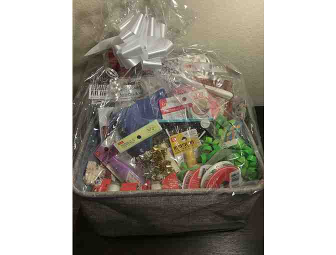 **Paper Cutter **Gold & Silver Wrapping paper **Black and White wrapping paper **Reusable Wine bag **2 Decorative tapes **2 packs of regular scotch tape **2 spools of Christmas ribbon **2 pack of green spiral bows **Gold and Silver mini gift bows **Birthday card **"A Little Note to Say" card **Blue tissue paper **Pink crinkle filler **Red crinkle filler **Floral gift bag **Happy Birthday gift bag **Stationary scissors **Bin