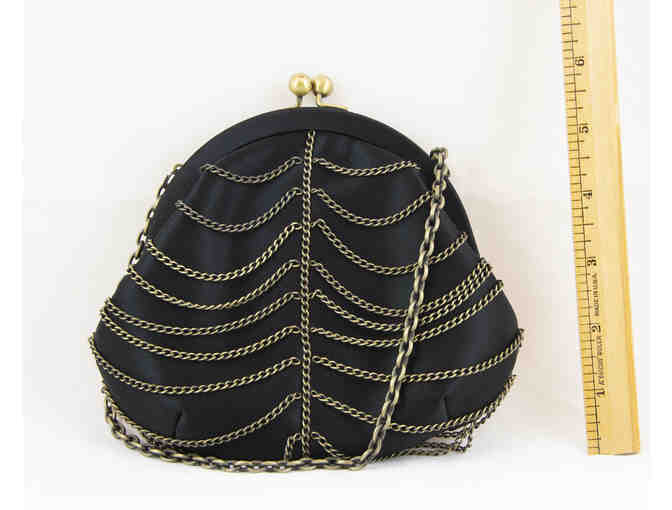 Designer evening bag by BCBG MAXAZRIA is in excellent pre-owned condition. Clasp closure, inside pocket, carrying chain with 6 inch drop. Bag is approximately 6" L and 6" W at widest point.